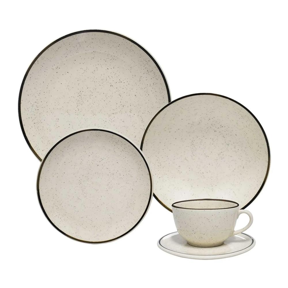 Traga a sensação de uma brisa de verão para a sua mesa com o Jogo de Jantar e Chá Unni Brisa. Inspirada na leveza e nos detalhes da praia, esta coleção de cerâmica apresenta um design clean e sofisticado. A decoração de pequenos grãos em preto remete à areia, enquanto o filete manual na cor marrom aplicado nas bordas imita a textura de materiais naturais como o bambu e a corda, garantindo que cada peça seja única e autêntica.